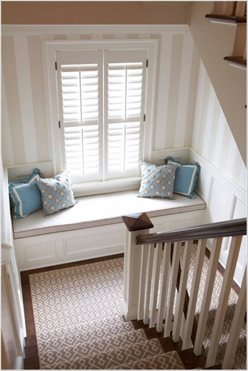 Ở phần chiếu nghỉ nơi đón ánh sánh cho ngôi nhà, các bạn có thể kê vào đó 1 kệ đựng đồ kết hợp phía trên là ghế ngồi cùng gối ôm sẽ rất thú vị cho cầu thang nhà bạn